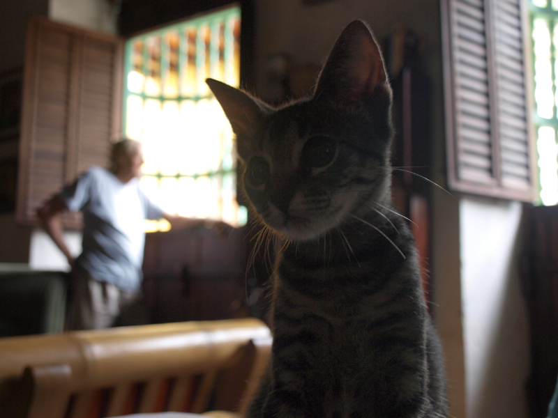 El alojamiento se solucionó fácilmente y fuimos al hotel que había reservado Ignacio cambiándonos a una habitación triple. Un hotel tranquilo y familiar dentro de la Ciudad Amurallada, regentado por una señora bonachona y bien entrada en carnes llamada Lucía, que veía televisión a la vez que se abanicaba y consentía a su gatito Chester, de tres meses. Resultaba ser la casa de sus padres, que ella había convertido en hospedería pero manteniendo su decoración y detalles coloniales, con un gran patio lleno de vegetación e incienso prendido para los mosquitos. Para alojarse en él fue requisito la recomendación de un anterior huésped, en este caso de nuestra compañera Sara.